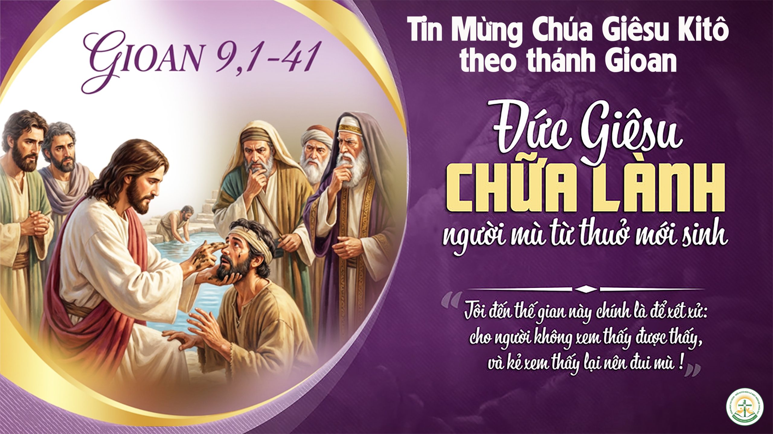 Khi ấy, Chúa Giêsu đi qua, thấy một người mù từ khi mới sinh. Người nhổ xuống đất, lấy nước miếng trộn thành bùn, rồi xoa bùn trên mắt người ấy, và bảo: “Anh hãy đến hồ Silôe mà rửa” (chữ Silôe có nghĩa là được sai). Anh ta ra đi và rửa, rồi trở lại thì trông thấy được. Những người láng giềng và kẻ xưa kia từng thấy anh ta ăn xin đều nói: “Đó chẳng phải là người vẫn ngồi ăn xin sao”. Có kẻ nói: “Đúng hắn”. Lại có người bảo: “Không phải, nhưng là một người giống hắn”. Còn anh ta thì nói: “Chính tôi đây”. Họ liền dẫn người trước kia bị mù đến với những người biệt phái, lý do tại Chúa Giêsu hoà bùn và chữa mắt cho anh ta lại nhằm ngày Sabat. Các người biệt phải cũng hỏi anh ta do đâu được sáng mắt. Anh đáp: “Người đã xoa bùn vào mắt tôi, tôi đi rửa và tôi được sáng mắt”. […] Rồi họ đuổi anh ta ra ngoài. Chúa Giêsu hay tin họ đuổi anh ra ngoài, nên khi gặp anh, Người liền bảo: “Anh có tin Con Thiên Chúa không”. Anh thưa: “Thưa Ngài, nhưng Ngài là ai để tôi tin Ngài?” Chúa Giêsu đáp: “Anh đang nhìn thấy Người và chính Người đang nói với anh”. Anh ta liền nói: “Lạy Ngài, tôi tin”, và anh ta sấp mình thờ lạy Người.