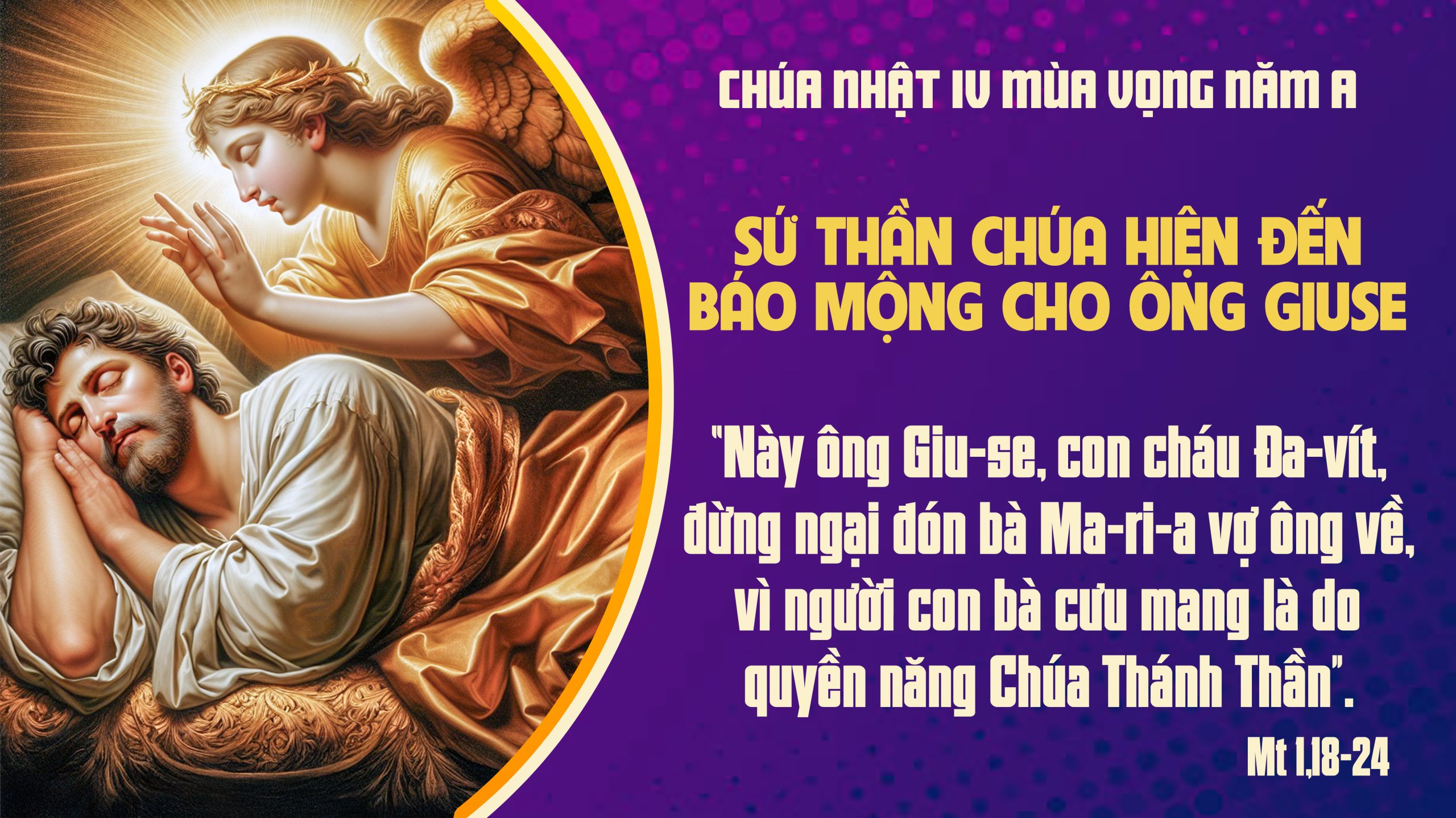 Nhưng đang khi định tâm như vậy thì thiên thần Chúa hiện đến cùng ông trong giấc mơ và bảo: “Hỡi Giuse, con vua Đavid, đừng ngại nhận Maria về nhà làm bạn mình, vì Maria mang thai là bởi phép Chúa Thánh Thần: bà sẽ hạ sinh một con trai mà ông sẽ đặt tên là Giêsu: VÌ chính Người sẽ cứu dân mình khỏi tội”. […].