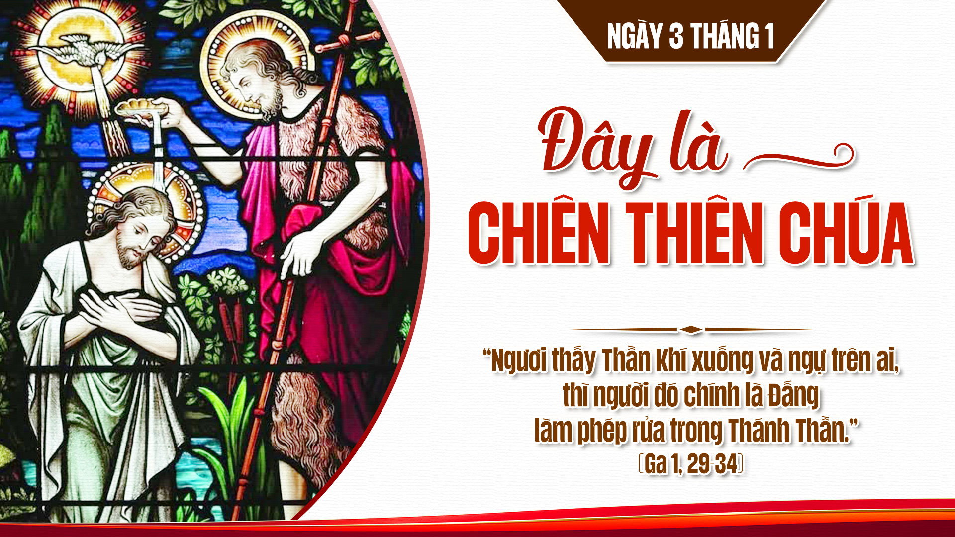 Ngày hôm sau, Gioan thấy Chúa Giêsu đến với mình thì nói: “Đây Chiên Thiên Chúa, đây Đấng xoá tội trần gian. Đây chính là Đấng mà tôi đã nói rằng: Có người đến sau tôi, nhưng cao trọng hơn tôi, vì Người vốn có trước tôi. Phần tôi, trước tôi không biết Người, nhưng tôi đã đến làm phép rửa bằng nước, để Người được tỏ mình ra trong Israel” Và Gioan đã làm chứng rằng: “Tôi đã thấy Thánh Thần như chim bồ câu từ trời xuống ngự trên Người. Và trước tôi không biết Người, nhưng Đấng đã sai tôi làm phép rửa trong nước bảo tôi: “Ngươi thấy Thánh Thần ngự xuống trên ai, thì chính người đó là Đấng làm phép rửa trong Thánh Thần.” Tôi đã thấy và làm chúng rằng: Người là Con Thiên Chúa.”