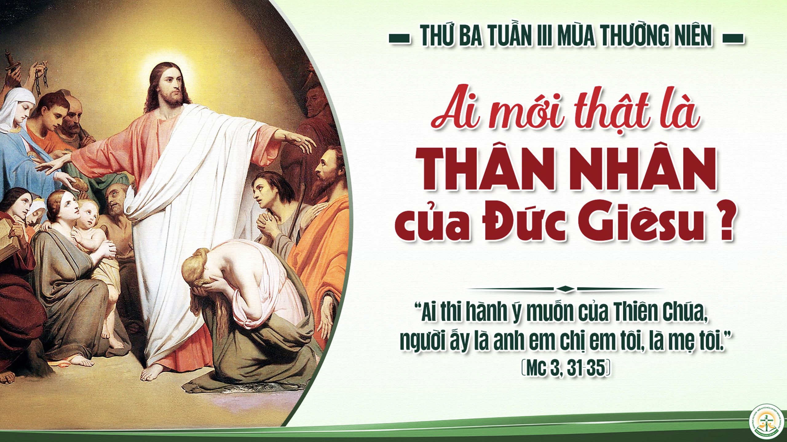 Khi ấy, mẹ Chúa Giêsu và anh em Người đến và đứng ở ngoài sai người, vào mời Chúa ra. Bấy giờ có đám đông ngồi chung quanh Người và họ trình Người rằng: “Kìa mẹ và anh em Thầy ở ngoài kia đang tìm Thầy.” Người trả lời rằng: “Ai là mẹ Ta? Ai là anh em Ta?” Rồi đưa mắt nhìn những người ngồi vòng quanh, Người nói: “Đây là mẹ Ta và anh em Ta. Vì ai làm theo ý Thiên Chúa, thì người ấy là anh chị em và là mẹ Ta.”