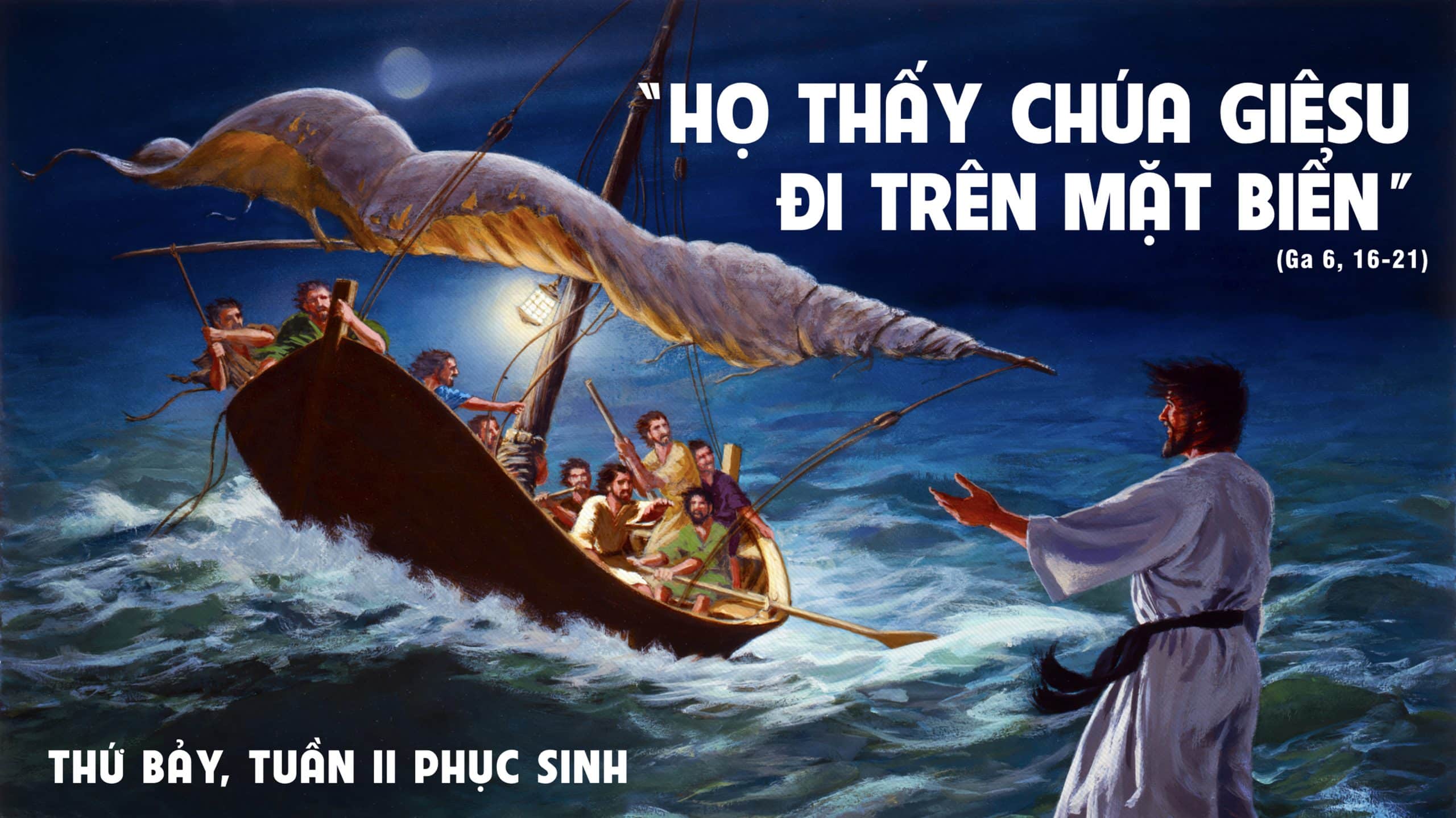 Chiều đến, các môn đệ của Chúa Giêsu xuống bờ biển, rồi lên thuyền, sang bên kia, trẩy về hưởng Capharnaum. Trời đã tối mà Chúa Giêsu vẫn chưa đến với họ. Bỗng cuồng phong nổi lên, biển động mạnh. Khi chèo đi được chừng hai mươi lăm hoặc ba mươi dặm, thì họ thấy Chúa Giêsu đi trên mặt biển, tiến lại gần thuyền, họ hoảng sợ. Nhưng Người nói với họ: “Chính Thầy đây, đừng sợ.” Họ định rước Người lên thuyền, nhưng ngay lúc ấy, thuyền đã đến nơi họ định tới.