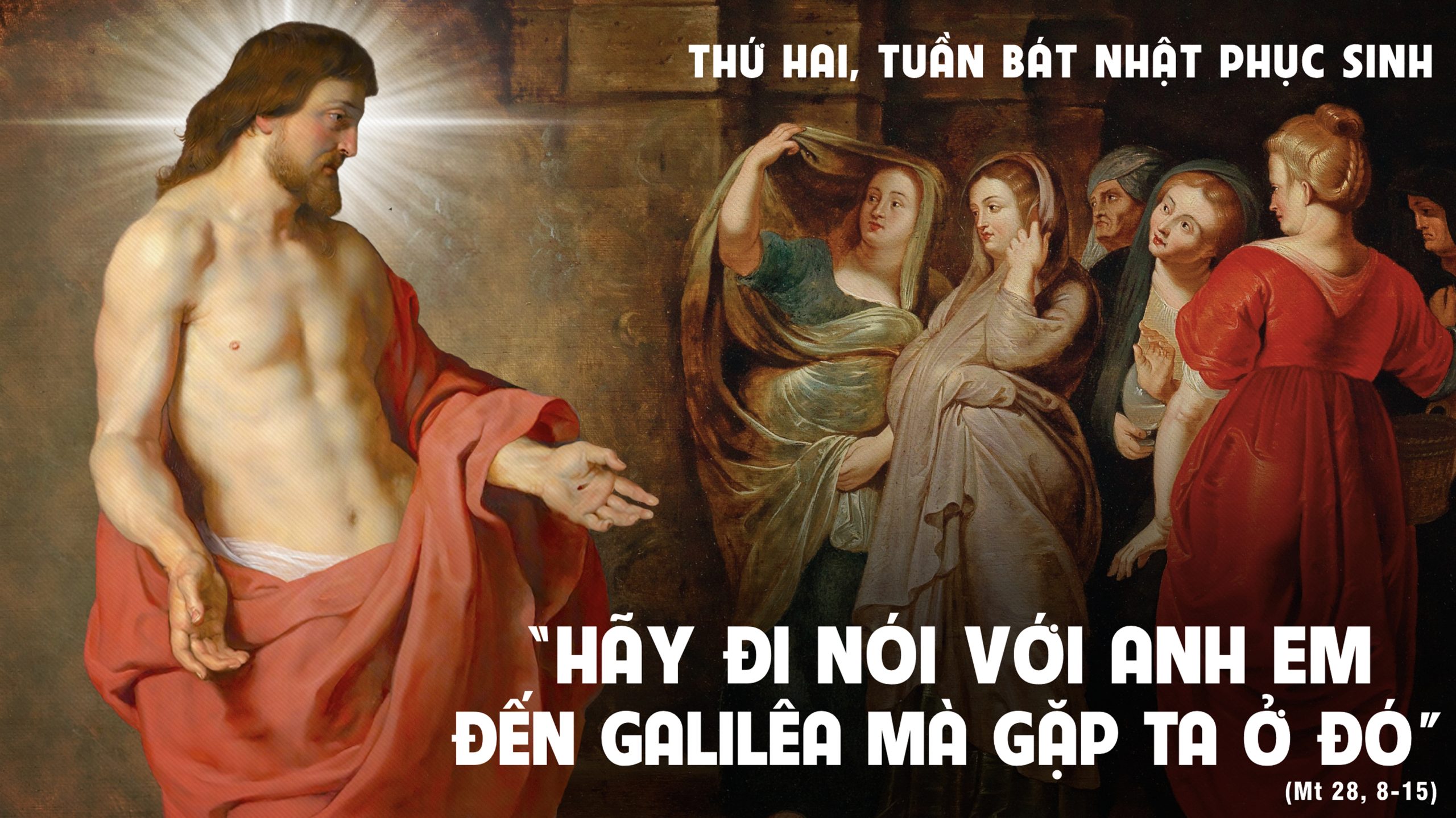 Khi ấy, các bà vội vã ra khỏi mồ vừa sợ hãi vừa hớn hở vui mừng, chạy báo tin cho các môn đệ Chúa. Và này, Chúa Giêsu đón gặp các bà, Người nói: “Chào các bà.” Các bà liền lại gần ôm chân Người và phục lạy. Bấy giờ Chúa Giêsu bảo: “Các bà đừng sợ. Hãy đi báo tin cho các anh em của Ta phải trở về Galilêa, rồi ở đó họ sẽ gặp Ta.” Đang khi các bà lên đường, thì mấy người lính canh vào thành báo tin cho các thượng tế biết tất cả những gì đã xảy ra. Các thượng tế liền họp với các kỳ lão, và sau khi bàn định, họ cho lính một số tiền lớn và bảo rằng: “Các anh hãy nói rằng: “Ban đêm khi chúng tôi đang ngủ, thì môn đệ ông đến lấy trộm xác ông. Nếu việc này đến tai tổng trấn, chúng tôi sẽ thương lượng với ông, không để các anh phải phiền hà đâu.” Bọn lính canh nhận tiền và đã làm y như họ căn dặn chúng. Bởi thế, lòi đó được phao truyền nơi người Do Thái cho đến ngày nay.