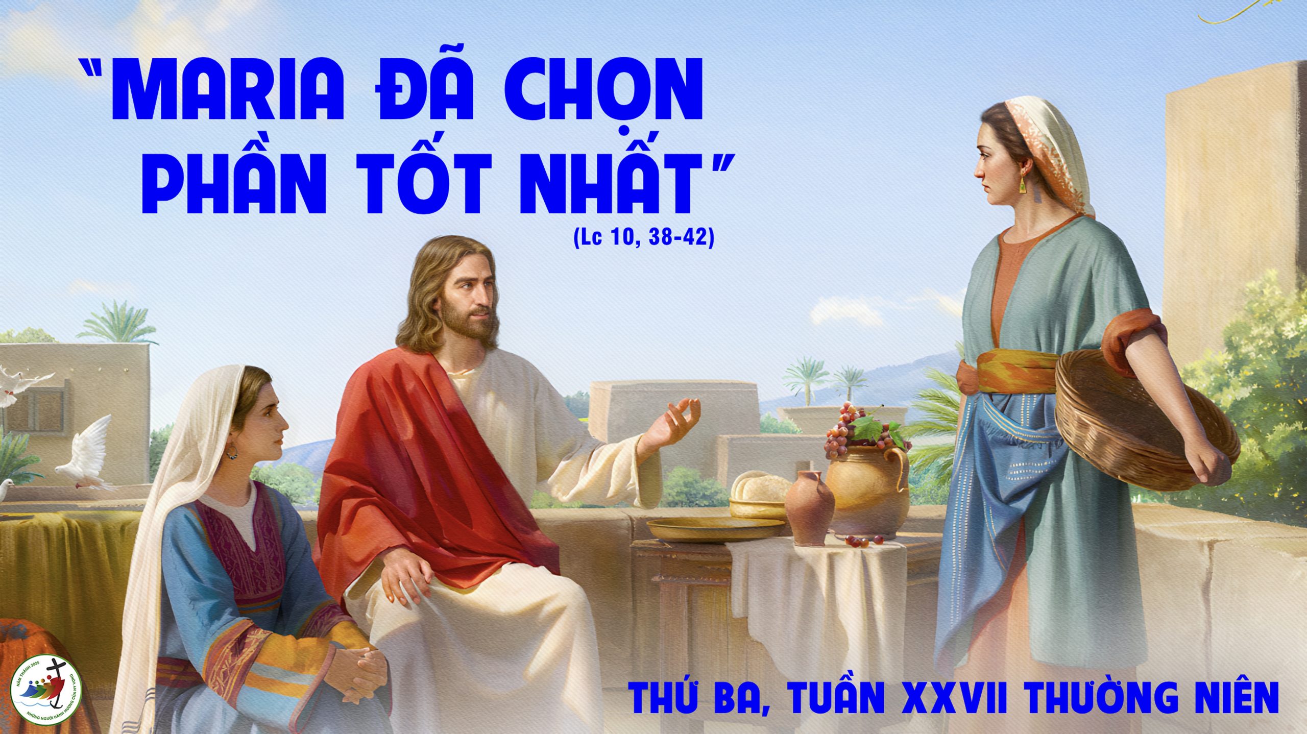 Khi ấy, Chúa Giêsu vào một làng kia và có một phụ nữ tên là Maria rước Người vào nhà mình. Bà có người em gái tên là Maria ngồi bên chân Chúa mà nghe lời Người. Marfa bận rộn với việc thết đãi khách. Bà đứng lại thưa Người rằng: “Lạy Thầy, em con để con hầu hạ một mình mà Thầy không quan tâm sao? Xin Thầy bảo em con giúp con với.” Nhưng Chúa đáp: “Marta, Marta, con lo lắng bối rối về nhiều chuyện. Chỉ có một sự cần thôi: Maria đã chọn phần tốt nhất và sẽ không bị ai lấy mất.”