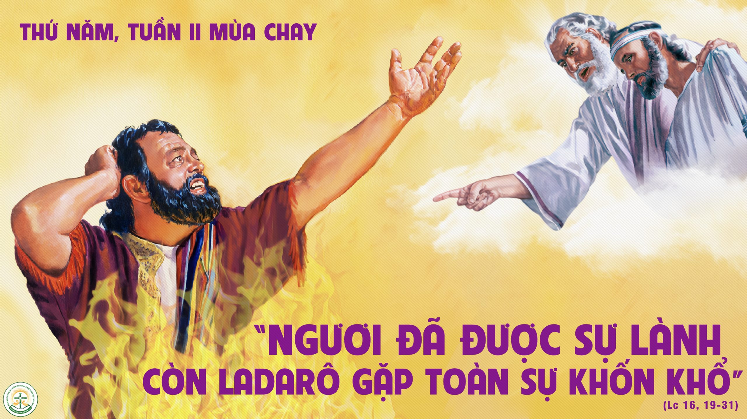 Khi ấy, Chúa Giêsu phán cùng những người biệt phái rằng: “Có một nhà phú hộ kia vận toàn gấm vóc, lụa là, ngày ngày yến tiệc linh đình. Lại có một người hành khất tên là Ladarô, nằm bên cổng nhà ông đó, mình đầy ghẻ chốc, ước được những mụn bánh từ bàn ăn rớt xuống để ăn cho đỡ đói, nhưng không ai thèm cho. […] Nhưng xảy ra là người hành khất đó chết và được các thiên thần đem lên nơi lòng Abraham. Còn nhà phủ hộ kia cũng chết và được đem chôn. Trong hoả ngục, phải chịu cực hình, nhà phú hộ ngước mắt lên thì thấy đàng xa có Abraham và Ladarô trong lòng Ngài, liền cất tiếng kêu la rằng: “Lạy cha Abraham, xin thương xót tôi và sai Ladarô nhúng đầu ngón tay vào nước để làm mát lưỡi tôi, vì tôi phải quằn quại trong ngọn lửa này.” Abraham nói lại: “Hỡi con, suốt đời con, con được toàn sự lành, còn Ladarô gặp toàn sự khốn khổ. Vậy bây giờ Ladarô được an ủi ở chốn này, còn con thì chịu khốn khổ. Vả chăng, giữa các ngươi và chúng tôi đây đã có sẵn một vực thẳm, khiến những kẻ muốn tự đây qua đó, không thể qua được, cũng như không thể từ bên đó qua đây được.” […]