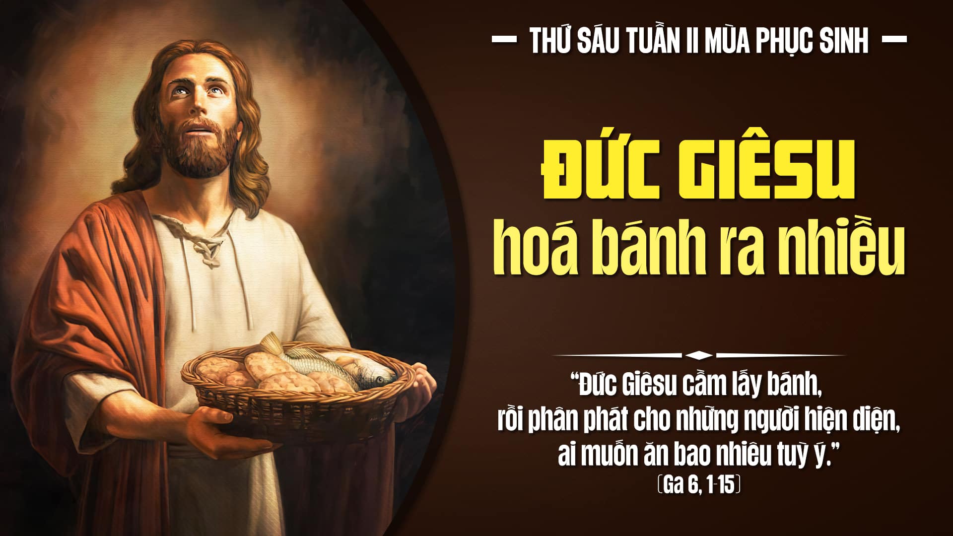 […] Khi ấy, Chúa Giêsu ngước mắt lên và thấy đám rất đông dân chúng đến với Người. Người hỏi ông Philipphê: “Ta mua đâu được bánh cho những người này ăn?” […] Philipphê thưa: “Hai trăm bạc bánh cũng không đủ để mỗi người được một chút.” Một trong những môn đệ tên là Anrê, em ông Simon Phêrô, thưa với Người rằng: “Ở đây có một bé trai có năm chiếc bánh lúa mạch và hai con cá, nhưng bấy nhiêu thì thấm vào đâu cho từng ấy người.” Chúa Giêsu nói: “Cứ bảo người ta ngồi xuống.” Nơi đó có nhiều cỏ. Người ta ngồi xuống, số đàn ông độ năm ngàn. Bấy giờ, Chúa Giêsu cầm lấy bánh, và khi đã tạ ơn, Người phân phát cho những kẻ ngồi ăn, và cá cũng phân phát như thế, ai muốn bao nhiêu tùy thích. Khi họ đã no nê, Người bảo các môn đệ: “Hãy thu lấy những miếng còn lại, kẻo phí đi.” Họ thu lại mười hai thúng đầy bánh vụn do năm chiếc bánh lúa mạch người ta ăn mà còn dư. Chúa Giêsu biết rằng người ta sắp đến bắt Người để tôn làm vua, nên Người lại trốn lên núi một mình.