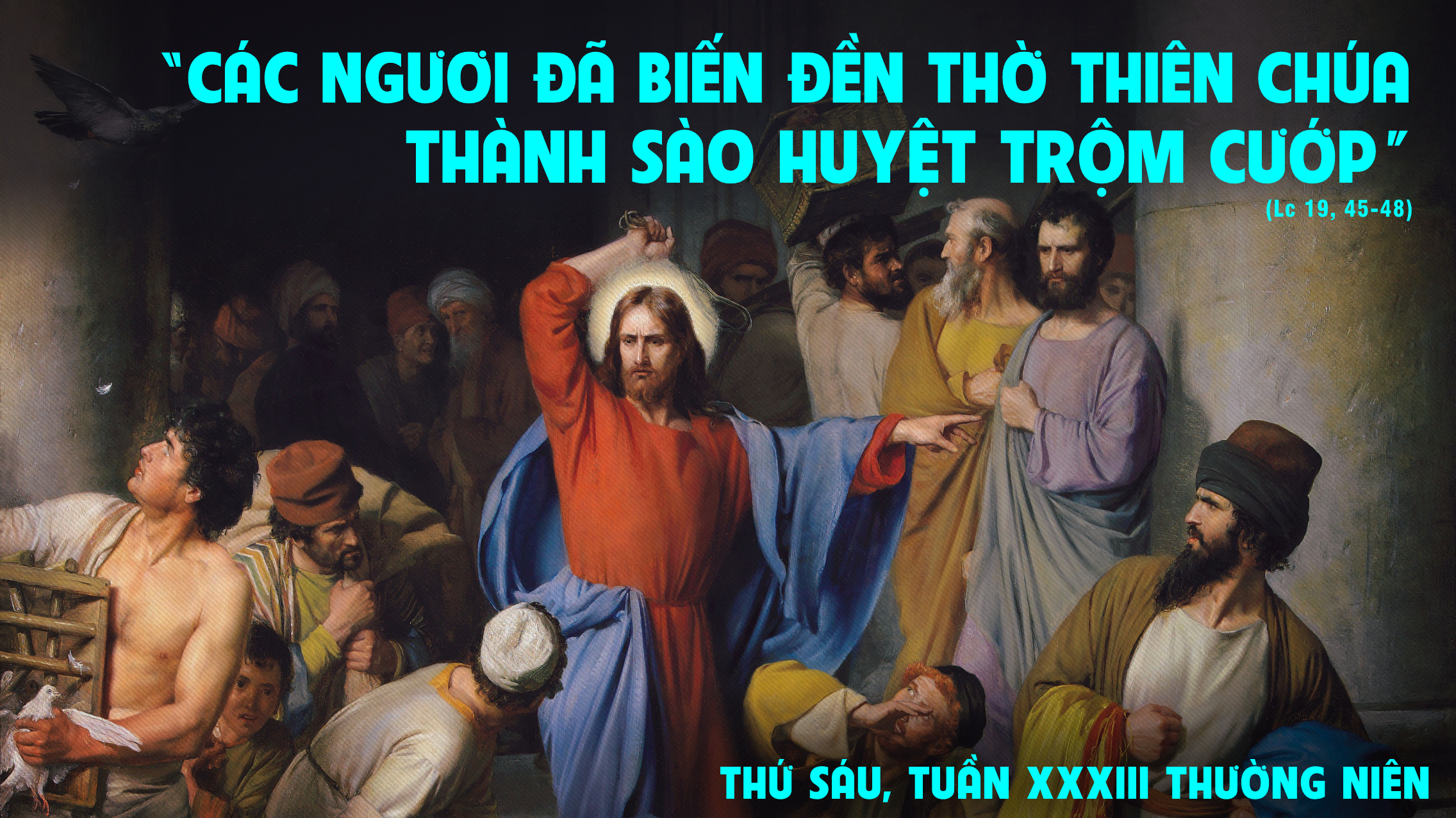 Khi ấy, Chúa Giêsu vào Đền thờ, Người liền xua đuổi các người buôn bán tại đó và phán bảo họ rằng: “Có lời chép rằng: Nhà Ta là nhà cầu nguyện, các ngươi đã biến thành sào huyệt trộm cướp.” Và hằng ngày Người giảng dạy trong Đền thờ. Các thượng tế, luật sĩ và kỳ lão trong dân tìm cách hại Người, nhưng họ không biết phải làm cách nào, vì dân chúng hết thảy đều chăm chú nghe Người.