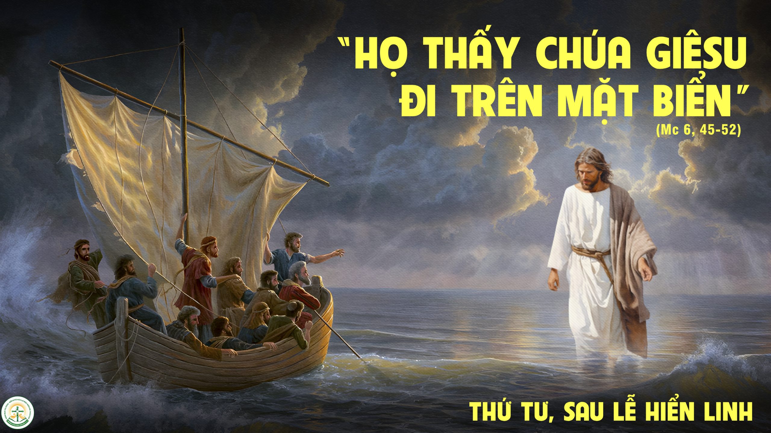 “Khi năm ngàn người đã được ăn no, Chúa Giêsu liền giục các môn đệ xuống thuyền, qua bờ bên kia trước mà đến Bétsaiđa, đang khi Người giải tán dân chúng. Giải tán họ xong, Người lên núi cầu nguyện. Chiều đến, thuyền đã ra giữa biển, còn Người thì ở một mình trên đất. Khoảng canh tư đêm tối, Người thấy họ khó nhọc chèo chống vì gió ngược, Người đi trên mặt biển mà đến với họ, và Người muốn vượt qua trước họ. Họ thấy Người đi trên mặt biển thì tưởng là ma, nên la hoảng lên. Vì ai nấy đều thấy Người và hoảng hốt, nên Người liền lên tiếng bảo họ rằng: “Hãy yên trí, chính Ta đây, đừng sợ”. Rồi Người lên thuyền của họ, và gió im lặng. Tâm hồn họ lại càng sửng sốt hơn, vì họ chưa hiểu gì về vấn đề bánh: lòng họ còn mù tối”.