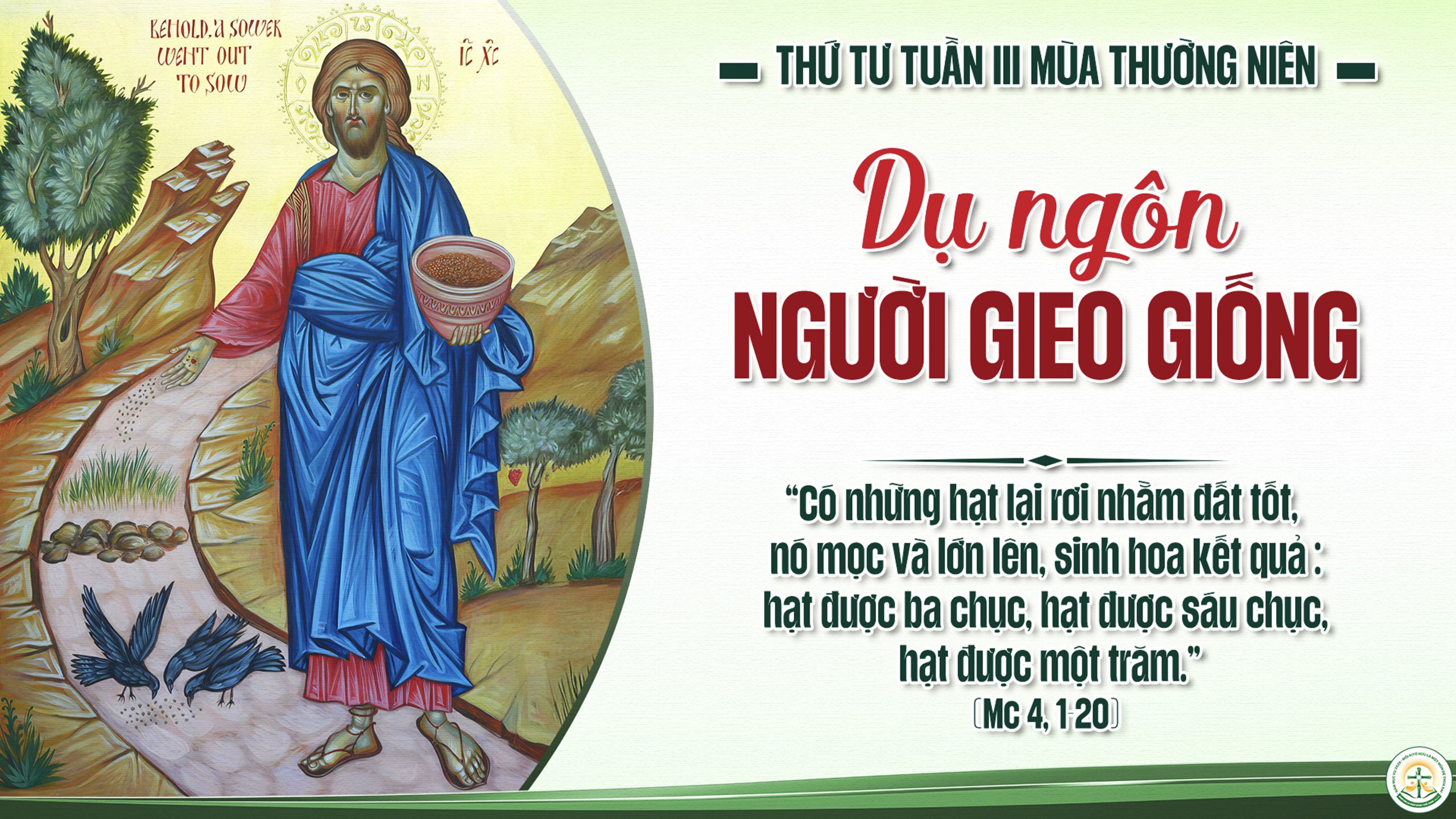 Khi ấy, […] Chúa Giêsu nói với họ rằng: “Người gieo hạt đi gieo hạt giống. Khi gieo, một phần hạt rơi xuống vệ đường và chim trời đến ăn hết. Phần khác rơi trên đất sỏi, nơi không có nhiều đất. Hạt giống đã mọc lên ngay, vì lớp đất không sâu. Nhưng khi mặt trời mọc lên, hạt giống bị nắng đốt và vì không rễ, nên bị chết khô. Một phần khác rơi vào bụi gai và gai mọc lên làm hạt giống chết mà không sinh hoa trái được. Phần hạt khác rơi vào đất tốt, mọc lên, nẩy nở và sinh quả, hạt thì sinh được ba mươi, hạt được sáu mươi, hạt được một trăm.” Và Người phán rằng: “Ai có tai để nghe thì hãy nghe.” […]