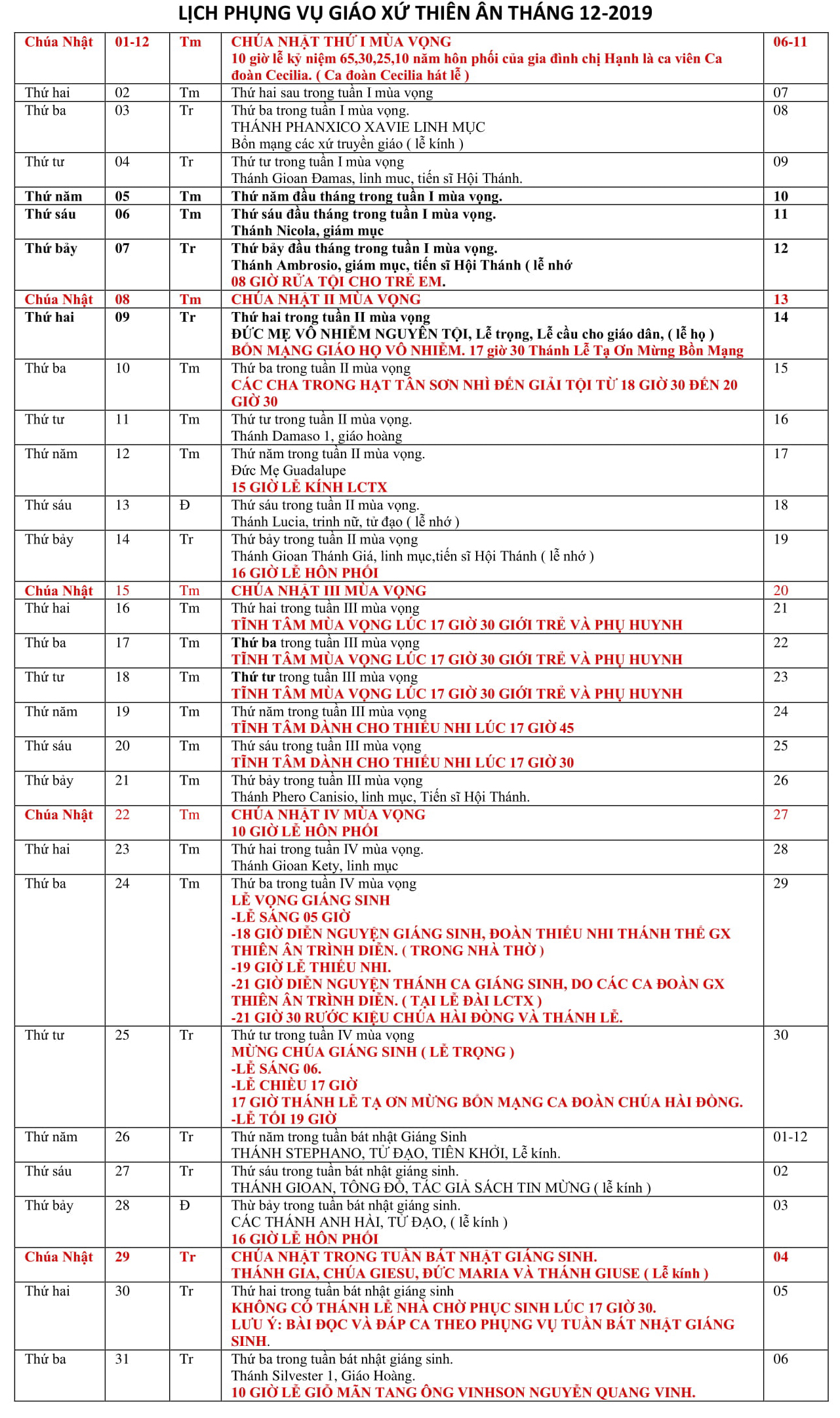 LỊCH PHỤNG VỤ GX THIÊN ÂN THÁNG 12-2019