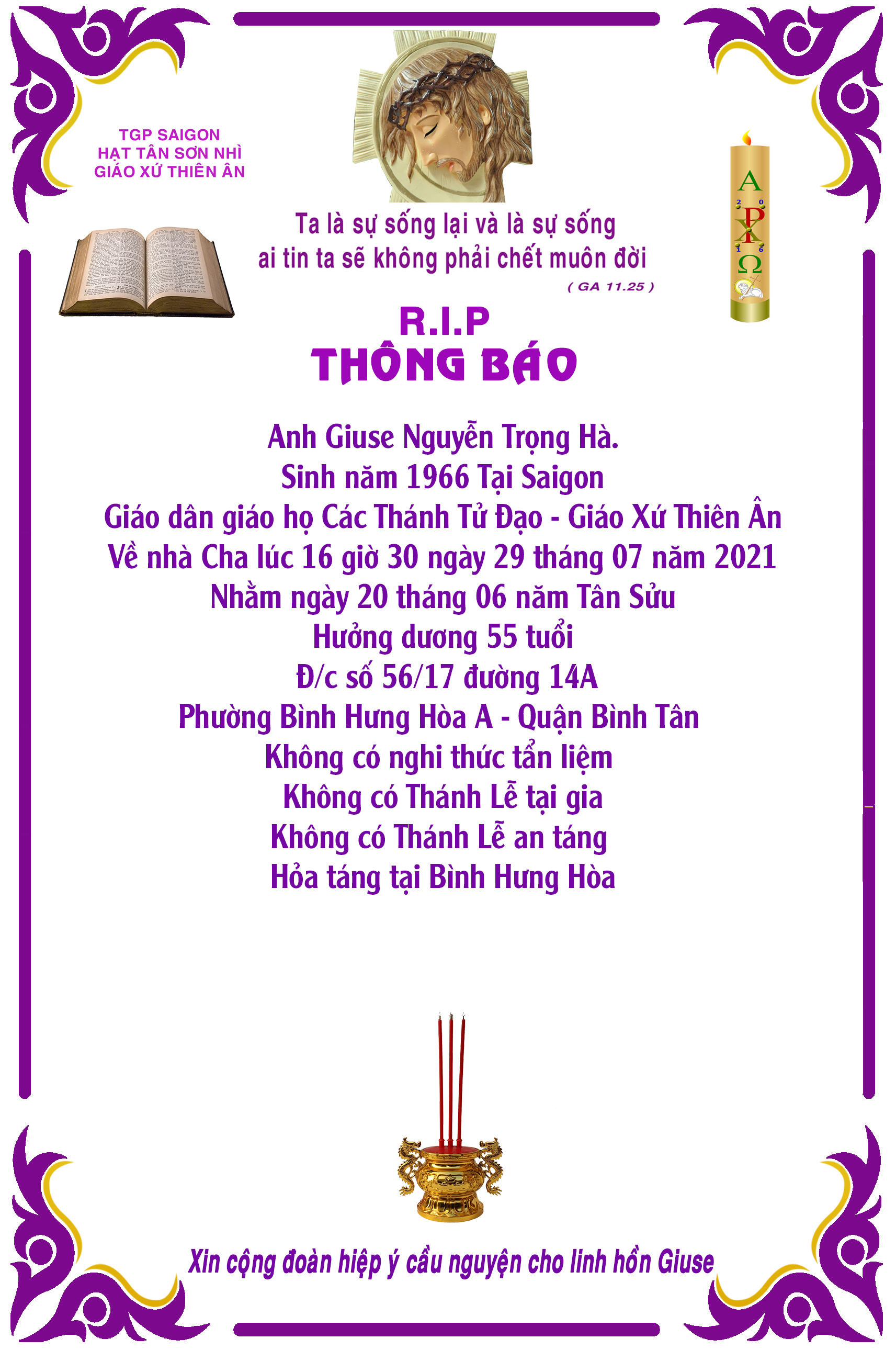 R.I.P ANH GIUSE NGUYỄN TRỌNG HÀ GIÁO DÂN GIÁO HỌ CÁC THÁNH TỬ ĐẠO GX THIÊN ÂN