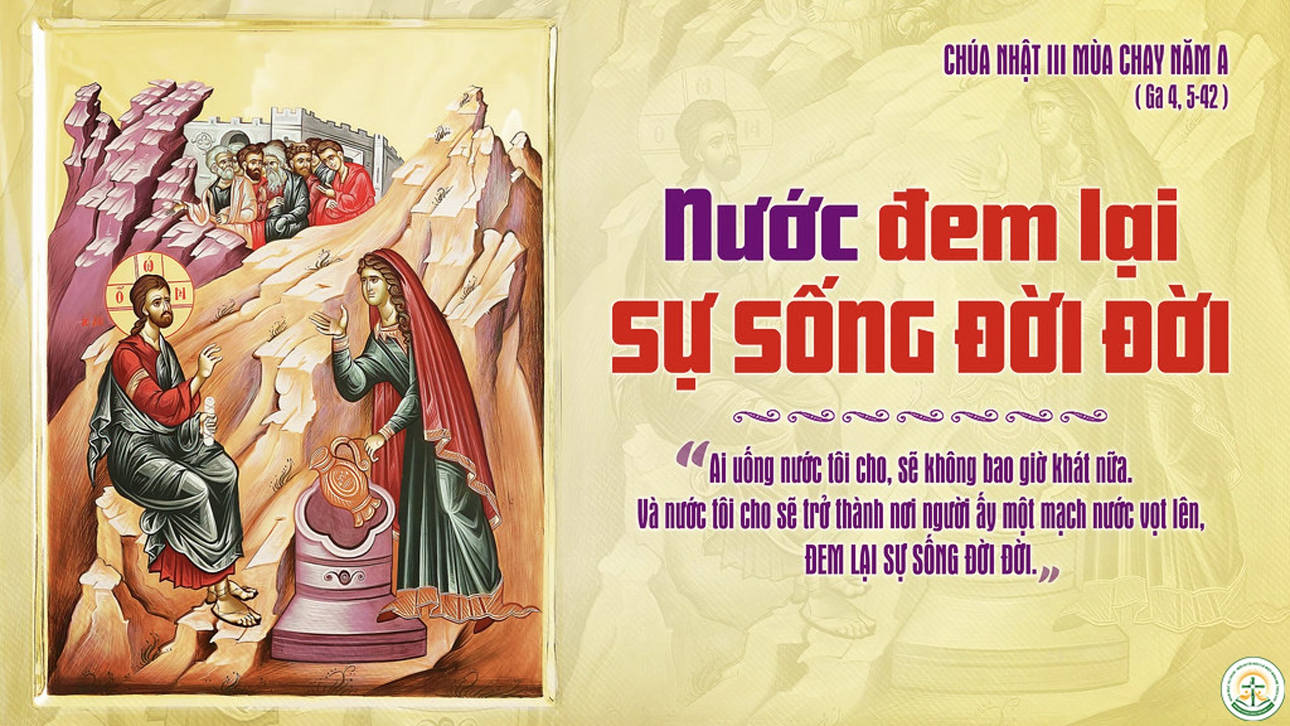 15 Người phụ nữ nói với Đức Giê-su : “Thưa ông, xin ông cho tôi thứ nước ấy, để tôi hết khát và khỏi phải đến đây lấy nước.” 16 Người bảo chị ấy : “Chị hãy gọi chồng chị, rồi trở lại đây.” 17 Người phụ nữ đáp : “Tôi không có chồng.” Đức Giê-su bảo : “Chị nói : ‘Tôi không có chồng’ là phải, 18 vì chị đã năm đời chồng rồi, và người hiện đang sống với chị không phải là chồng chị. Chị đã nói đúng.” 19 Người phụ nữ nói với Người : “Thưa ông, tôi thấy ông thật là một ngôn sứ … 20 Cha ông chúng tôi đã thờ phượng Thiên Chúa trên núi này ; còn các ông lại bảo : Giê-ru-sa-lem mới chính là nơi phải thờ phượng Thiên Chúa.” 21 Đức Giê-su phán : “Này chị, hãy tin tôi : đã đến giờ các người sẽ thờ phượng Chúa Cha, không phải trên núi này hay tại Giê-ru-sa-lem. 22 Các người thờ Đấng các người không biết ; còn chúng tôi thờ Đấng chúng tôi biết, vì ơn cứu độ phát xuất từ dân Do-thái. 23 Nhưng giờ đã đến -và chính là lúc này đây- giờ những người thờ phượng đích thực sẽ thờ phượng Chúa Cha trong thần khí và sự thật, vì Chúa Cha tìm kiếm những ai thờ phượng Người như thế. 24 Thiên Chúa là thần khí, và những kẻ thờ phượng Người phải thờ phượng trong thần khí và sự thật.” 25 Người phụ nữ thưa : “Tôi biết Đấng Mê-si-a, gọi là Đức Ki-tô, sẽ đến. Khi Người đến, Người sẽ loan báo cho chúng tôi mọi sự.” 26 Đức Giê-su nói : “Đấng ấy chính là tôi, người đang nói với chị đây.”