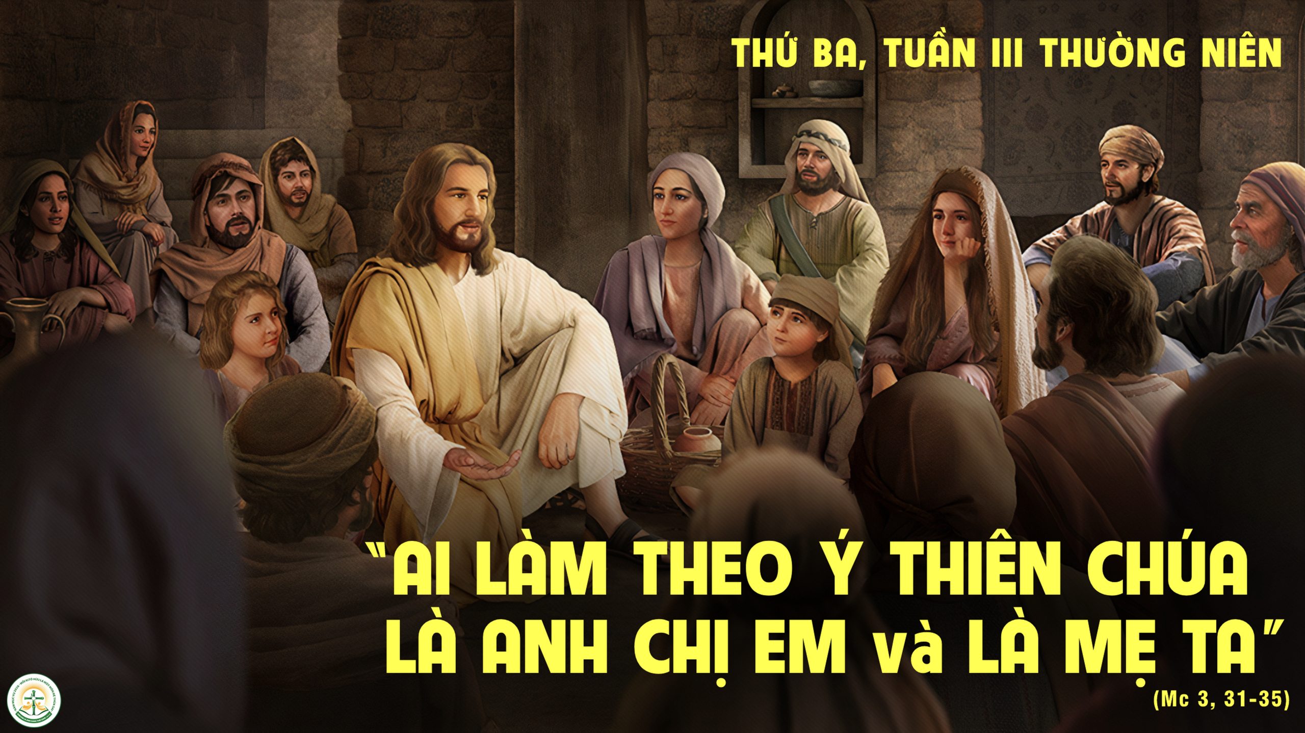 31 Khi ấy, mẹ và anh em Đức Giê-su đến, đứng ở ngoài, cho mời Người ra. 32 Lúc ấy, đám đông đang ngồi chung quanh Người. Có kẻ nói với Người rằng : “Thưa Thầy, có mẹ và anh em chị em Thầy ở ngoài kia đang tìm Thầy !” 33 Nhưng Người đáp lại : “Ai là mẹ tôi ? Ai là anh em tôi ?” 34 Rồi Người rảo mắt nhìn những kẻ ngồi chung quanh và nói : “Đây là mẹ tôi, đây là anh em tôi. 35 Ai thi hành ý muốn của Thiên Chúa, người ấy là anh em chị em tôi, là mẹ tôi.”