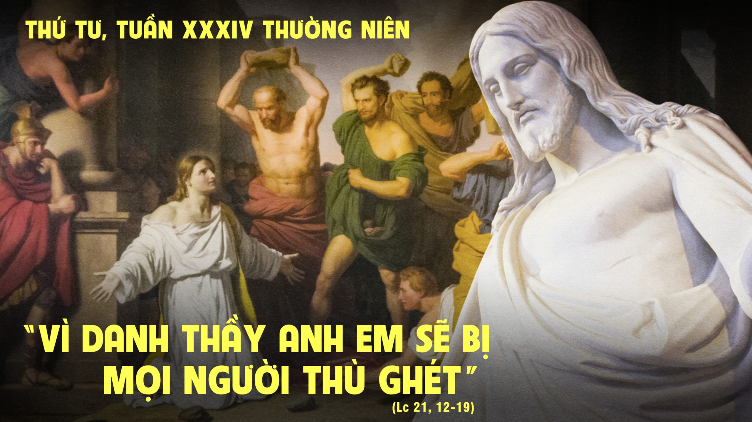 12 Khi ấy, Đức Giê-su nói với các môn đệ rằng : “Người ta sẽ tra tay bắt và ngược đãi anh em, nộp anh em cho các hội đường và bỏ tù, điệu anh em đến trước mặt vua chúa quan quyền vì danh Thầy. 13 Đó sẽ là cơ hội để anh em làm chứng cho Thầy. 14 Vậy anh em hãy ghi lòng tạc dạ điều này, là anh em đừng lo nghĩ phải bào chữa cách nào. 15 Vì chính Thầy sẽ cho anh em ăn nói thật khôn ngoan, khiến tất cả địch thủ của anh em không tài nào chống chọi hay cãi lại được. 16 Anh em sẽ bị chính cha mẹ, anh chị em, bà con và bạn hữu bắt nộp. Họ sẽ giết một số người trong anh em. 17 Vì danh Thầy, anh em sẽ bị mọi người thù ghét. 18 Nhưng dù một sợi tóc trên đầu anh em cũng không bị mất đâu. 19 Có kiên trì, anh em mới giữ được mạng sống mình.”