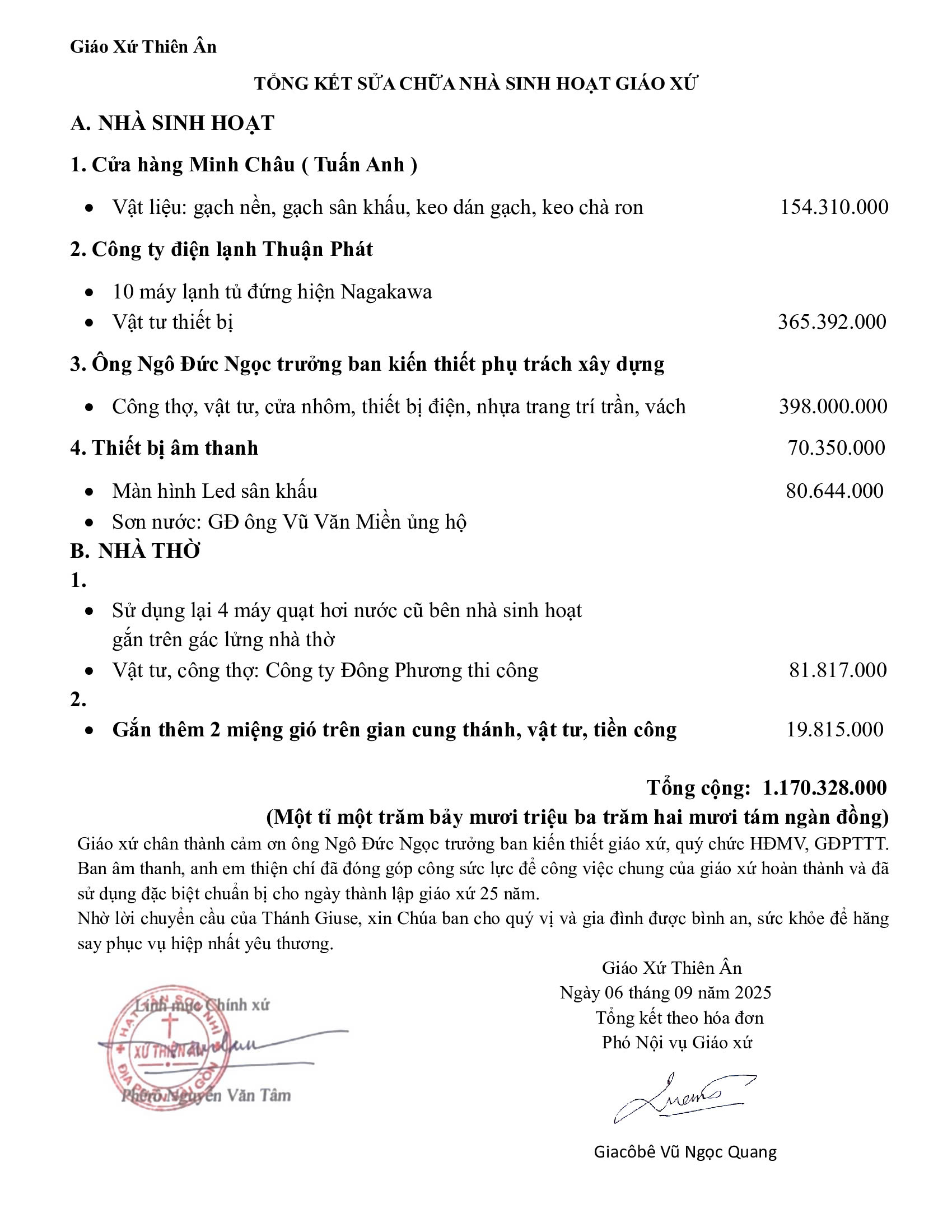Xin Thiên Chúa rộng ban muôn ơn lành cho Quý Đức Giám mục, Quý Cha, Quý Ân nhân và toàn thể Quý vị đã góp phần dựng xây ngôi nhà Chúa bằng những cách thế khác nhau.